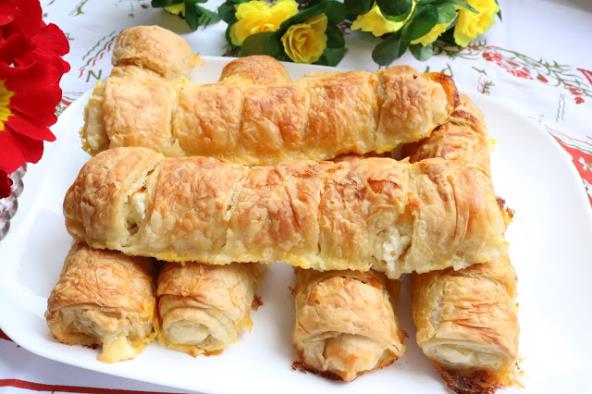 Namazati 4 kore tom smešom na dno staviti sir. Koru podeliti na pola saviti ivice i uviti u rolnicu.