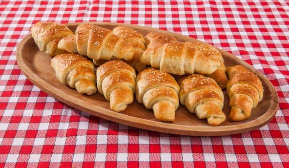 Kada testo naraste, premesiti ga i podeliti na 5 kolačića. Svaki kolačić razviti na krug (što tanji) i iseći na 8 trouglova. Trouglove filovati sirom (sir i pavlaku smo pomešali i malo začinili), saviti u kiflice i ređati u pleh. Premazati ih jajetom, posuti susamom i preko njih staviti listiće margarina (1 margarin na sve kifle).