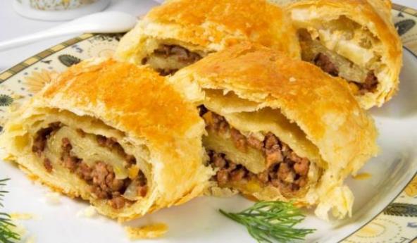 3. Dinstano meso naneti na rastanjenu koru,uviti u rolat i premazati umućenim jajetom.