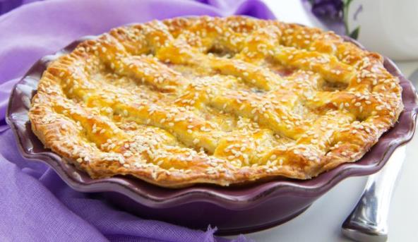 3. Razvucite 2/3 testa na debljinu od 3-4 mm i prebacite u podmazanu tepsiju. Izbockajte dno viljuškom, premažite senfom i sipajte fil. Pokrijte površinu preklapajući trakama od preostalog testa i postpite susamom. Pecite 45 minuta na 180 stepeni.