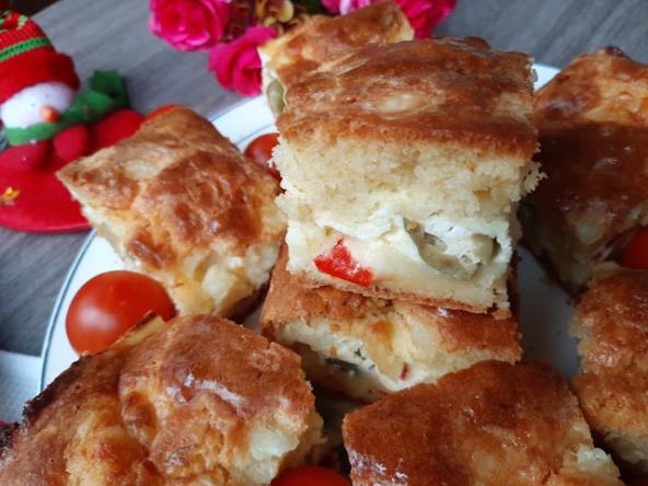 Na sir rasporediti sečene masline i sečenu papriku. Preko njega sipati pavlaku i rasporediti a zatim i drugi deo testa.