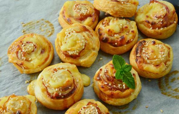 U posudu narendati ementaler, dodati suvi biljni začin i sve zajedno dobro promešati. Odmrznuto lisnato testo rastanjiti na veličinu 25x35 cm i premazati razmućenim jajetom, pa posuti sa polovinom sira i uviti u rolnu. Iseći je na 12 jednakih širokih krugova u obliku pužića i staviti na pobrašnjen pleh. Ponoviti postupak i sa drugim delom testa. Pužiće od lisnatog testa premazati razmućenim jajetom i staviti da se peče na 220°C oko 20 minuta.