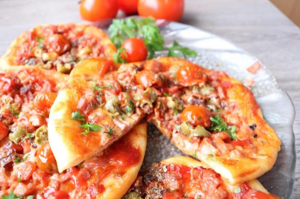 Zamesiti glatko testo, ostaviti da malo odmori iseći male lopte i rukama istanjiti. Premazati kečapom, dodati seckanu šunku sir, masline seckane i origano. Peći na 220 stepeni oko 20 min. Pred kraj dodati rendan kačkavalj.