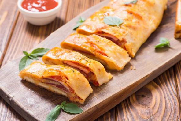 Umutite jaja, dodajte jogurt, griz, ulje i prašak za pecivo. Polovinom te smese premažite 4 kore, jednu, preko druge, a petu premažite kečapom, narendajte pola kačkavalja, pola šunke i malo origana. Uvijte u rolat. Na isti način napravite i drugi rolat, samo što ćete i petu koru tanko premazati smesom od jaja, narendajte ostatak kačkavalja i šunke.