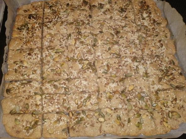 Pomešajte oba brašna, sodu bikarbonu i so. Dodajte kiselu vodu, ulje i malo jače od polovine svih semenki. Umesite čvrsto testo i ostavite da odstoji. Razvaljajte testo od nekoliko milimetara na pek papiru, pa isecite male pravougaonike. Premažite ulje, a ako ne postite možete i jajetom. Testo sa pek papirom prebacite u pleh, pa ako želite pospite ostatak semenki preko testa i pecite nekih 10-15 minuta na 180°C. Pazite da vam ne izgore.