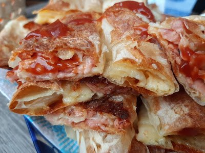 Jednu koru malo poprskati uljem staviti 3 kašike sira pa premazati celu koru. Odozgo pobacati parizer, malo kećapa i dodati origano.