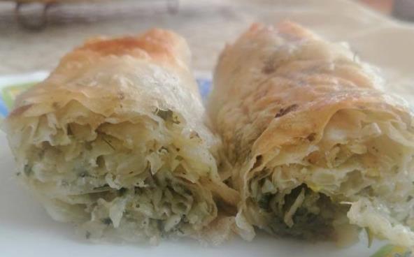Iseckajte crni luk i prodinstajte ga. Koprivu i zelje obarite i sitno iseckajte. Zeleniš dodajte u tiganj gde vam se nalazi luk, pa izrendajte i krompir i sve to zajedno dinstajte na tihoj vatri. Začinite suvim biljnim začinom i biberom i dobro promešajte. Odvojite po četiri kore. Svaku koru premažite sa po malo fila, a na četvrtu staviti više i urolajte. Pitu isecite pre pečenja. Pecite na 250°C dok ne porumeni, pa smanjiti temperaturu na 200°C i peći oko 30 minuta.