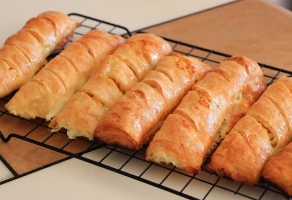 Mažite pet kora ovim prelivom, za svaki premaz ide 3-4 kašike preliva. Isecite na četiri dela, stavite sir, umotajte i svaku pitu zacesite ukoso. Prelijte ostatkom preliva i ostavite deset minuta na tepsiji, višak preliva istresite.