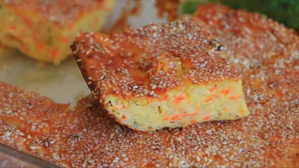 Umutite jaja, dodajte mleko, ulje, so, začin, biber, pavlaku, brašno. Promešajte. Dodajte izrendan krompir, šargarepu, luk, peršunovo lišće. Izlijte u pleh, pospite susamom i pecite na 200 stepeni 40 minuta do sat vremena. Pečeno i vruće premažite maslacem ili margarinom. Prijatno!