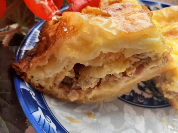 Iseckajte i propržite crni luk, zatim dodajte mleveno meso i šunku. Kada meso bude gotovo dodajte po želji beli luk, biber, so, jedno jaje i promešajte. Pleh veličine 30x20 cm premažite sa uljem, pa stavite prvu koru na dno tako da kora visi sa strane i pouljite. Zgužvati drugu koru kao harmoniku, pa stavite preko prve. Tako radite dok ne potrošite pola kora. U sredinu stavite sav nadev. Raspredite, pa ređajte odozgo ostatak kora i svaku pouljite. Na predzadnjoj kori savite i ove koje vise sa strane i pokrijte zadnjom korom. Isecite nožem na kocke. Umutite jaja, pa dodajte pavlaku, mleko, malo ulja i na vrh noža praška za pecivo. Sipajte na isečenu pitu i na mesta gde je sečena. Malo pouljite i pecite na 210°C 50-55 min.