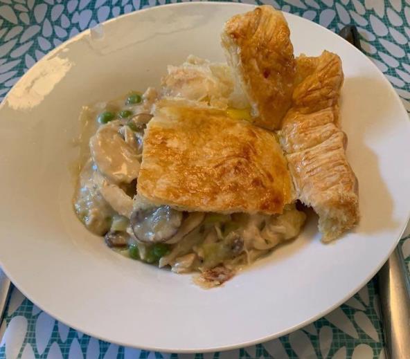 Priprema: Zagrejte rernu na 200°C. U tiganju zagrejte 15 g putera i kašiku maslinovog ulja, zatim dodajte iseckane šampinjone i kuvajte kratko dok ne omekšaju. Dodajte sitno seckan beli luk. Posle par minuta izvadite pečurke i stavite u neku posudu. U isti tiganj stavite 15 g putera i kašiku maslinovog ulja, pa dodajte seckan praziluk i seckanu majčinu dušicu. Kuvajte dok luk ne omekša. Kad luk omekša dodajte brašno, promešajte, pa dodajte bujon i grašak. Mešajte dok ne proključa i grašak se ne skuva. Zatim sklonite sa vatre i dodajte kiselu pavlaku. Promešajte, pa dodajte pečurke i piletinu koju ste prethodno skuvali i iscepkali na veće komade. Posolite i pobiberite. Stavite u posudu u kojoj ćete peći, pa lisnato testo razvucite na srednju debljinu. Po dužini isecite traku (veličine ivice tepsije) i njom obložite ivicu koju ste prethodno navlažili vodom. Preko cele pite i ivica prebacite ostatak testa i odsecite višak. Prstom pritisnite ivicu. U posudi pomešajte mleko i jaje i tom smesom premažite testo. Nožem napravite prorez na sredini. Pecite nekih 20-25 minuta.