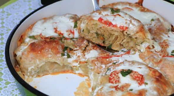 Izdinstajte luk na ulju, dodajte iseckanu šargarepu i vodu. Krčkajte 3 minuta pa dodajte oguljen i iseckan patlidžan, so, biber, peršun. Krčkajte oko 7 minuta. Ostavite da se prohladi pa dodajte umućeno jaje. Premazujte 2 kore sa premazom od ulja i vode, na treću koru ide fil. Umotajte u oblik puža ili slažite na tepsiju bez motanja. Premažite pite prelivom za kore i ostavite da stoje 15 minuta. Pecite na 220 stepeni oko 30 minuta, prelijte umućenim kiselim mlekom i vratite u rernu na 5 minuta. Prijatno!