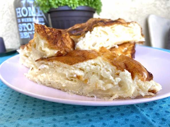 Umutiti četiri jaja, posoliti i dodati jogurt, nastaviti mućenje, sipati vodu i ulje, umutiti zatim dodati prašak za pecivo i sjediniti. Fil je spreman. Po dnu tepsije staviti dve kore, zatim savijati ostale kore na tračice ( slično harmonici ) preliti filom, špatulom lepo rasporediti fil da svuda dopre. Umutiti jaje i sa malo ostalog fila premazati. Peći 25-30minuta na 200 stepeni. Prijatno!