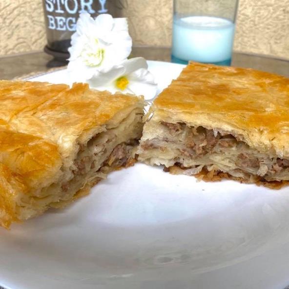 Propržite luk na ulju dok ne dobije zlatnu boju, dodajte meso, posolite i pobiberite, pa upržite. Tepsiju pouljite, zatim stavite dve kore, pa počnite sa ređanjem kora, stavite fil, poprskajte koru sa vodom i uljem. Ponavljajte proces dok imate materijala. Pecite na 180°C 30 minuta.