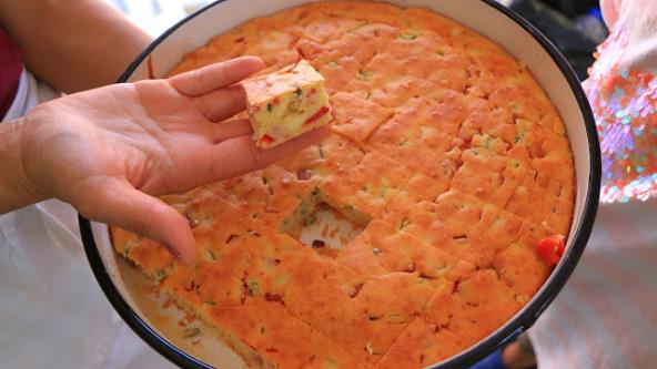 Umutite 5 jaja i dodajte sve ostale sastojke osim susama. Dobro izmesajte da ne bude grudvica pa umešajte iseckan sir, salamu, krastavce i papriku. Stavite susam ako zelite. Odmah stavite u vruću rernu i pecite oko 35 minuta. Proverite čačkalicom. Isecite kada se malo prohladi da bi kocke imale ravne ivice. Ako volite vruću možete je i odmah seci. Prijatno!