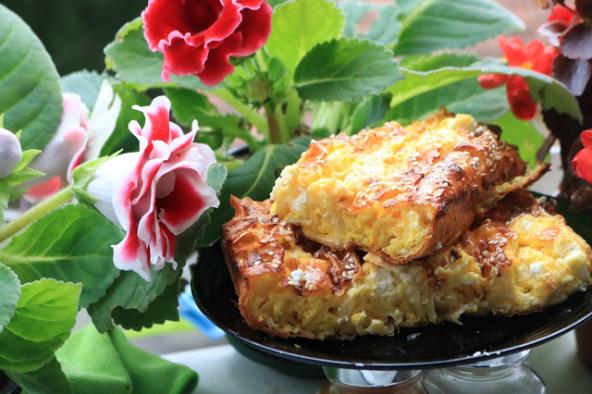 Sir izdrobiti na krupnije parčiće. U kiselo mleko dodati jaja i ulje i izjednačiti. Pleh veličine 40x20 cm premazati dobro uljem.
