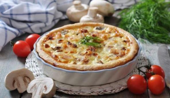 3. Testo razvaljajte i stavite u podmazan kalup (okruglu tepsiju). Od testa oblikujte rub, a po testu rasporedite piletinu i povrće. Prelijte smesom od kiselog mleka i ijaja, pa pecite oko 45 minuta.