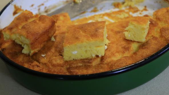 Umutite kratko žumanca, dodajte mleko, jogurt, vodu, so. Promešajte pa mikserom umešajte brašno. Sir izmrvite u testo. Od belanaca umutite čvrst sneg i lagano umešajte u testo, ne zaboravite i pola kesice praška za pecivo. Sipajte u tepsiju u kojoj se rastopio maslac, ne treba ga hladiti. Varjačom ili kašikom par puta prođite kroz testo i odmah pecite u zagrejanoj rerni na 200 stepeni. Peče se oko 30 minuta ili dok ne vidite da je rumeno i da je testo iznutra pečeno. Prijatno!