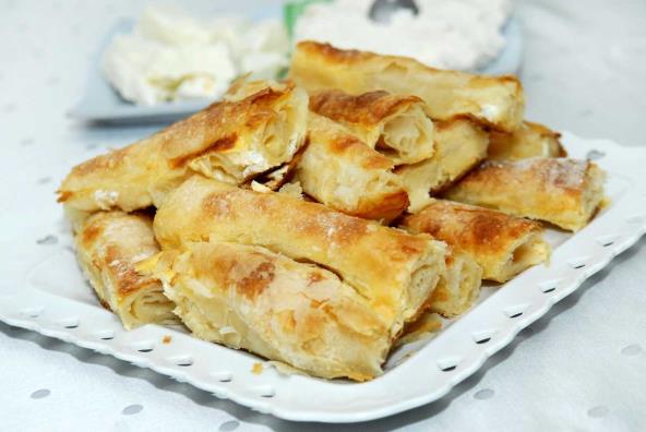 3. Površinu (sto) na kojoj ćete razvlačiti kore pokrijte čistim stolnjakom ili čaršavom, pa sredinu pospite brašnom. Uzmite prvu loptu testa i oklagijom je razvucite što tanje možete (trebalo bi da dobijete krug promera od pola metra). Zagrejte u šerpici ulje i ostavite ga na ringli, pa koru premažite uljem da ne bi pucala dok je razvlačite. Zavucite ruke ispod kore i pažljivo je rastežite (ili ako ste vešti podignite testo i vrtite ga – razvlačite rukama. Kad koru razvučete preko celog stola, možete je filovati po želji. Nafilovanu koru premestite u pleh, pa postupak ponovite s druge dve kore.