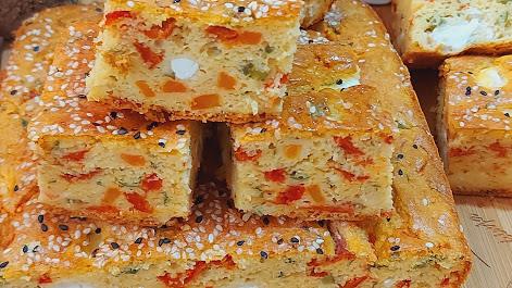Umutite jaja, dodajte prosejana oba brašna sa praškom za pecivo. Posolite, pa dodajte seckanu papriku, krastavčiće na kockice kao i šargarepu, ulje, jogurt i seckan peršun. Sve malo izjednačite, pa na kraju dodajte sir na kockice.