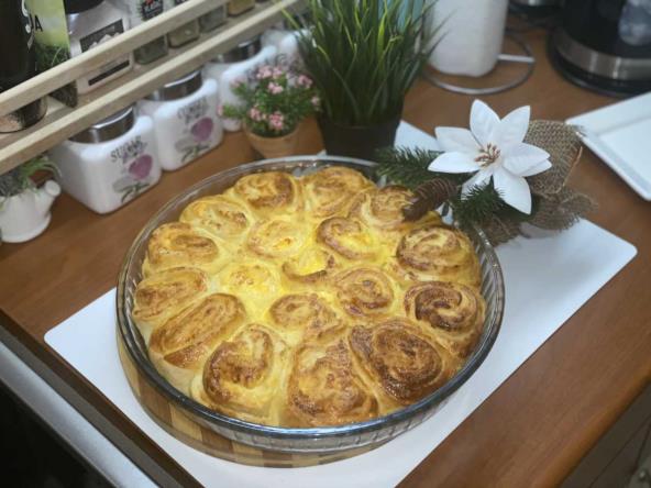 Kvasac aktivirati u mleku, dodati šećer, jogurt, 1 jaje, malo soli i dve do tri kašike brašna. Promešati i sačekati desetak minuta proces aktivacije. Nakon toga postepeno dodavati ostatak brašna. Umesiti glatko testo i ostaviti da odstoji oko pola sata. Iseći na dva dela, i razvući u pravougaonik. Staviti otopljenu mast preko testa. Premazati filom koji se sastoji od 250gr sitnog sira i 2 jaja. Iseci komade i redjati u posudu za pečenje. Ostaviti jos desetak minuta da još malo naraste. Premazati žumancem i jogurtom pa peći na 200 stepeni 30-35min.