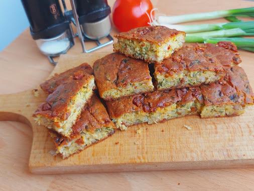 Dodati biber i so pa ubaciti u brašno. Sve dobro izjednačiti. Pleh veličine 35x25 podmazati i sipati testo. Peći na 210 stepeni 50-60 min. Prohlađeno seći..