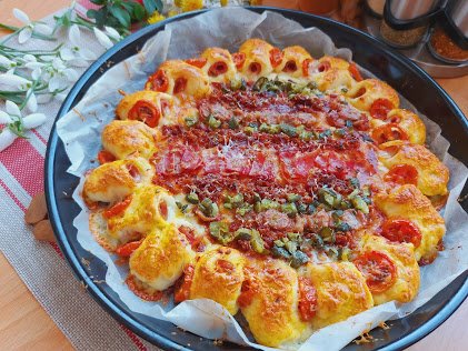 Istresti testo na sto pa ga razviti što tanje. U listove šunke uviti štapiće kačkavalja i ređati po testu blizu ivice u krug. Saviti ivice i pritisnuti.