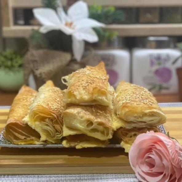 Sastojke za fil umutiti. Pet kora premazati pa iseći unakrsno. Svaku četvrtinu namazati filom i uviti u rolnicu. Ponavljati proces dok ima materijala. Redjati u pleh pa preliti ostatkom fila i susamom. Peći na 200 stepeni 25-30min. Prijatno!