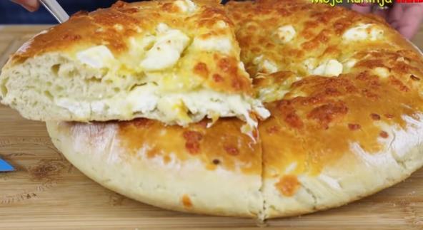 Pomešajte izrendan čedar i izmrvljenu fetu, pa sjedinite. Odvojite nekih 50 g sa strane, a od ostatka napravite loptu. Na dobro pobrašnjenu površinu stavite testo, pospite sa još malo brašna i premesite. Razvucite testo rukama i na sredinu stavite loptu od sira. Obložite sir testom sa svih strana, još malo pospite brašnom, pa opet rukama razvucite prečnika otprilike 22-25 cm. Tepsiju dobro nauljite sa svih strana i stavite testo. Premažite sa umućenim žumancetom. Preko pospite onaj sir što ste izdvojili sa strane (50 g). Pecite u zagrejanoj rerni na 180°C nekih 30 minuta.