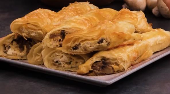 Pomešajte kačkavalj, krem sir i jaje. Beli luk sitno iseckajte i propržite, pa dodajte pečurke isečene na kriške. Posolite i pobiberite. Kada se pečurke uprže dodajte ih u sir. Razvučeno testo na kraju malo preklopite (pogledaj u videu postupak na 1:08) i stavite fil, malo peršuna seckanog preko, ostatak kore premažite uljem, pa urolajte. Stavite u pleh obložen pek papirom. Preostalo jaje umutite, pa premažite pitu. Pecite na 180°C nekih 30 minuta.