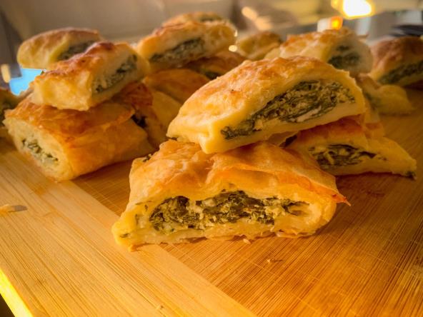 Sve kore premažite sa filom od griza (oko 5 kašika), složite kore jednu na drugu, pa na zadnju stavite uz ivicu fil sa spanaćem. Uvijte rolat. Premažite rolate sa ostacima filova. Isecite rolate na parčiće debljine oko 2 cm. Ostavite kratko da kore lepo upiju tečnost.
