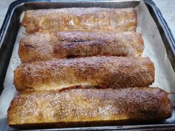 Za premazivanje rolata: Umutite 1 jaje, malo soli i 2 kašike ulja. Ovom smesom premžite rolat i pospite susamom. Pecite na 200°C oko 30 minuta.