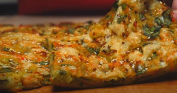 U veliki pleh od rerne staviti papir za pečenje i istresti celu smesu. Poravnati i staviti da se peče 25 minuta. Posle 25 minuta posuti rendani sir i ako volite neke semenke. Peći još 25 minuta.