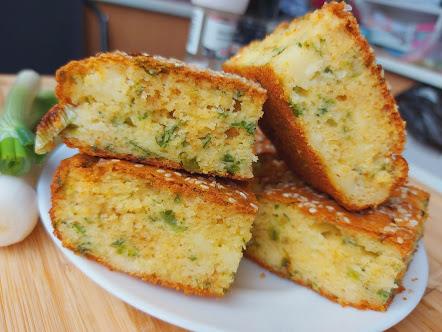 Dodati jogurt, mleko, seckan luk, peršunov list i malo soli. Dobro promešati i sipati u podmazan pleh. Izjednačiti, posuti susamom i peči na 200 stepeni oko 50-60 min da se dobro ispeče. Služiti toplu.