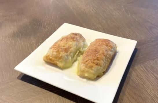 Piletinu iseckajte, pa dodajte seckani luk, začine i malo ulja. Sve sjedinite. Lisnato testo isecite na četvrtine, pa stavite meso na svaki deo. Umotajte testo lepo i ređajte u nauljen pleh. Premažite uljem i pecite na 200°C nekih 20 minuta. Zatim izvadite, prelijte bujonom i vratite na još 15 minuta.