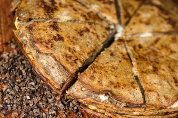 Ispecite palačinke po receptu za palačinke od heljdinog brašna. Umutite fil od 4 jaja i sira i kajmaka. Palačinke ređajte u tepsiju: jedna palačinka, pa fil, pa palačinka… Na kraju prelijte sa filom koji vam je preostao, isecite na parčiće i stavite da se zapeče u rerni.