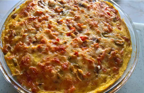 Umutite jaja i mleko, pa prelijte preko svega. Pecite na 180°C oko 35-40 minuta.