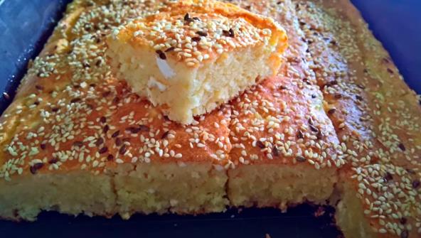 Umutiti jaja pa dodati jogurt i ulje. Mutiti još malo. Dodati prašak za pecivo i so, zatim brašno i griz. Lepo sjedinite. Dodajte mrvljen sir, promešajte.