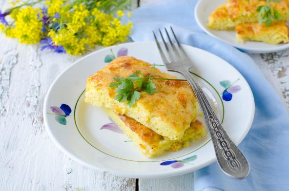 Krompir ogulite i isecite na kockice. Luk očistite i iseckajte na sitno. Zatim dodajte sve ostale sastojke i dobro promešajte. Smesu je potrebno izliti na nauljenu tepsiju veličine 20 x 40 cm, pa peći 20 minuta na 250 stepeni. Nakon što tepsiju izvadite iz rerne ostavite nekoliko minuta da se ohladi, pa onda isecite na kocke.