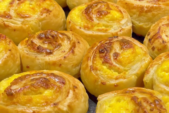 Dodajte siru jedno jaje, posolite, izrendajte kačkavalj i promešajte. Na lisnato testo stavite fil od sira i jaja, razmažite, pa uvijte kao u rolat, i isecite na komade. Uzmite maslac da premažete pleh, pa ubacite pite u pleh. Koristite jaje za premazivanje i pecite 30 minuta na 180°C.