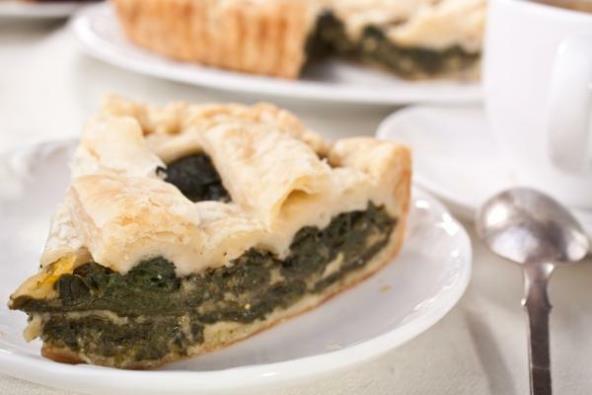 3. Izmesiti testo i obložiti okvir za kolače (prečnika 26 cm). Staviti kelj, luk, gaudu i preliti jajima. Peći 30–40 minuta.