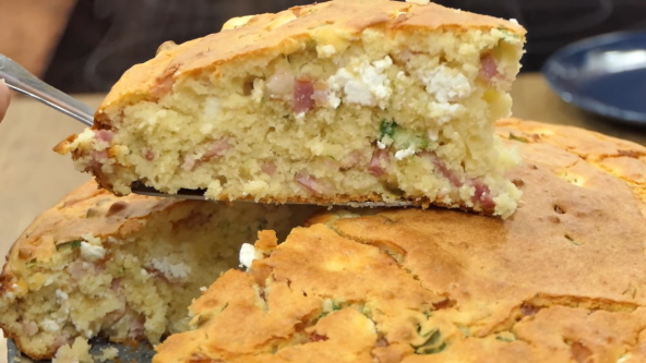 Umutite jaja sa šećerom. Zatim dodajte so, mleko, istopljeni puter i brašno sa praškom za pecivo. Dobro promešajte i dodajte sitno seckani mladi luk, slaninu i feta sir. Nauljite tepsiju i pospite brašnom. Sipajte dobijenu smesu. Pecite u zagrejanoj rerni na 180°C oko 40 minuta.