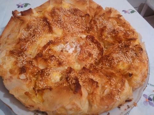 Umutiti jaja dodati udrobljen sir , jogurt pecivo. Sve lepo izjednačiti. Svaku koru malo pouljiti pa razmazati dve tri kašike fila. Koru skupiti kao harmoniku pa je uvijati u krug i redjati u podmazan pleh. Sve to raditi dok se ne utroši sav materijal. Odozgo posuti malo susam i peći u zagrejanoj peći da porumeni na 200 C oko 30 min.