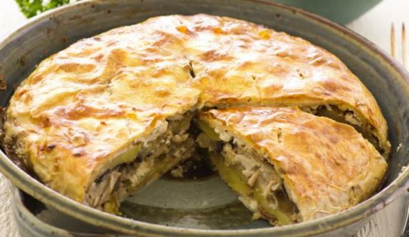 5. Razvucite 2/3 testa na debljinu od 3-4 mm i prebacite u podmazanu tepsiju. Izbockajte dno viljuškom, premažite senfom i sipajte fil. Pokrijte površinu preklapajući trakama od preostalog testa.
