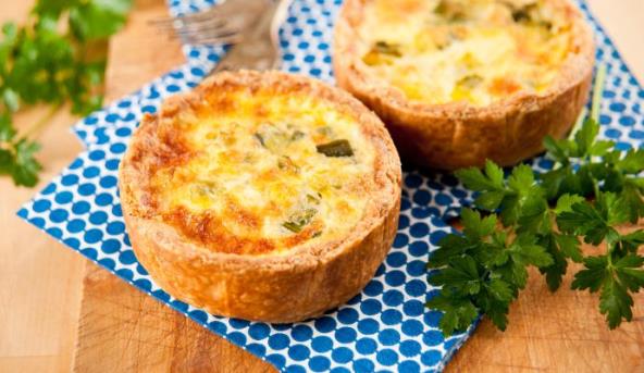 3. Rernu zagrejati na 200 stepeni. Testo rastanjiti na dasci posutoj brašnom. Deset podmazanih malih kalupa za pite (prečnik 10 cm) ili kalupa za mafine prekriti testom. Ivice testa izvući, a višak odseći. Dno testa na više mesta izbosti viljuškom.