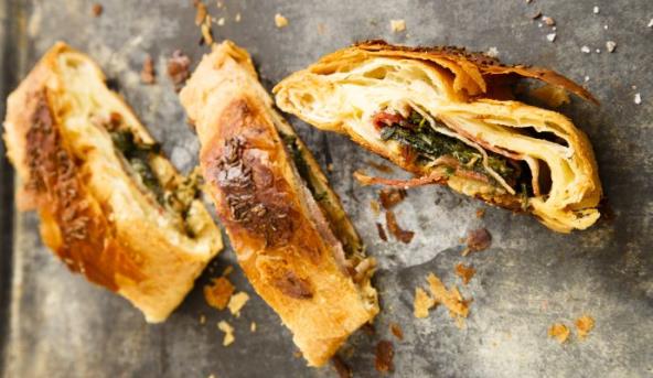 4. Na ispečenu i prohlađenu koru poređajte slaninu, sir i fil od spanaća i pažljivo uvijte u rolat. Po želji možete premazati žumancetom i posuti kimom ili susamom. Pecite rolat u rerni zagrejanoj na 200 stepeni oko 10 minuta.