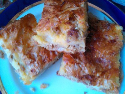 Ulje sipati u šerppicu i dodati sitno seckan crveni luk, propržiti dok ne bude staklast i proziran a zatim dodati mleveno meso. Pržiti još par minuta pa dodati začin (1 k.k. začina) i malo bibera. U mlaku vodu dodati pecivo i još malo ulja to sve zimešati. Četvrtast pleh premazati uljem pa slagati tri kore koje ste poprskali vodom a na četvrtu stavljajte fil mesa, i sve tako dok sve ne utrošite sve sastojke.
