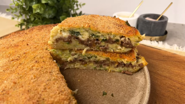 Tikvice i krompir izrendajte i ocedite od viška vode. Pomešajte u jednoj činiji. Dodajte jaja, so, brašno i dobro promešajte. Izlijte pola smese u nov čist tiganj. Preko stavite meso sa lukom, odozgo narendan sir, i svež peršun, pa drugu polovinu smese od tikvica. Pre stavljanja u rernu pospite prezlama. Pecite na 200 stepeni 40 minuta.