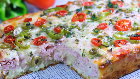 U posudi pomešajte jaja, ulje, papriku koju ste sitno iseckali, luk koji ste sitno iseckali, peršun sekcani i jogurt. Dobro umutite sastojke. Dodajte malo mleka i brašno i dobro sjedinite. Zatim dodajte rendani sir i prašak za pecivo i dobro promešajte. Tepsiju u kojoj ćete peći pitu premažite puterom i pospite brašnom. Sipajte smesu i poravnajte. Isecite 150 g šunke i 150 g sira na kockice, pa poređajte prvo šunku, a onda i sir. Pospite origanom i seckanim peršunom. Preostalu šunku i sir izrendajte, pa poređajte preko, prvo šunku, a onda i sir. Ukrasite maslina isečenim na kolutove, crnim lukom isečenim na rebarca, kao i paprikom isečenom na trake. Završite čeri paradajzom isečenim na kolutove. Pospite origanom i seckanim peršunom. Pecite na 180°C oko 45 minuta.