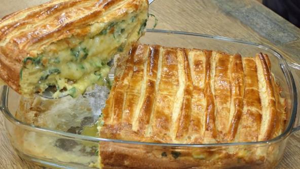 Pripremite fil tako što ćete u činiji pomešati umućena jaja sa rendanim sirom i seckanim peršunom. Isecite lisnato testo na 4 komada iste veličine. Prvi komad stavljamo u podmazan pleh sa malo ulja. Stavite ravnomerno preko cele kore trećinu nadeva. Potom druga kora, pa nadev, pa treća kora, nadev i na kraju prekrijte preostalim komadom lisnatog testa. Premazati umućenim žumancetom. Pecite u prethodno zagrejanoj rerni na 190°C 40 minuta.